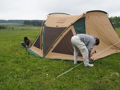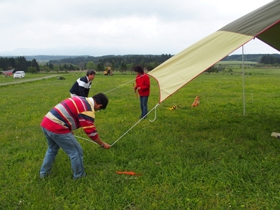 まずは場所を決めて、皆でタ―プとテントの設置です。