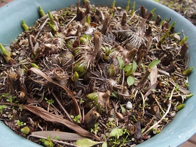 ユリ科の球根みたいな株から、小さな芽がツンツン出ていて