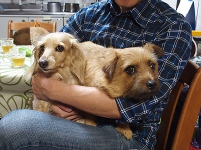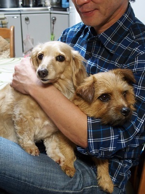 しまちゃんがワンコ花束状態でふたりを抱っこ。