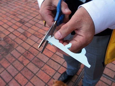 いきなり胸元からハサミと色紙を出してきて
