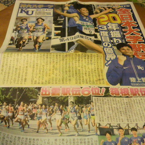 全日本大学駅伝優勝の記事が載った新聞と
